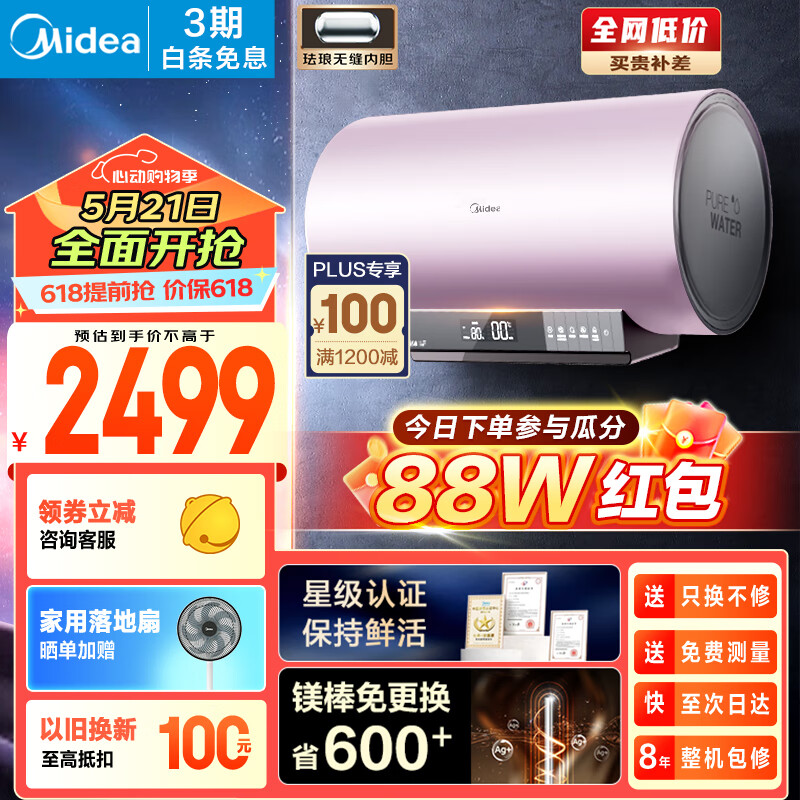 美的(Midea)TECH活水系列电热水器80升免换镁棒 3300W变频速热净肤洗智能八重净滤F8033-HQ3(HE)凝霜芋价格:2699.00元!
