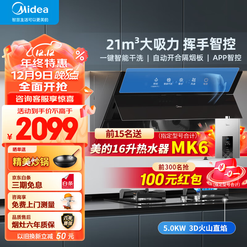 美的(Midea)抽油烟机燃气灶套装 侧吸式家用脱排烟机灶具套装 21风量自智能挥手动清洗J39+Q230A液化气价格:2249.00元!