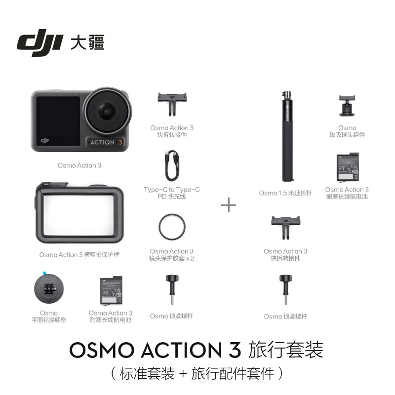 大疆 DJI Osmo Action 3 旅行套装 运动相机 露营旅游vlog摄像机便携式户外 头戴相机+128G内存卡价格:1970.90元!