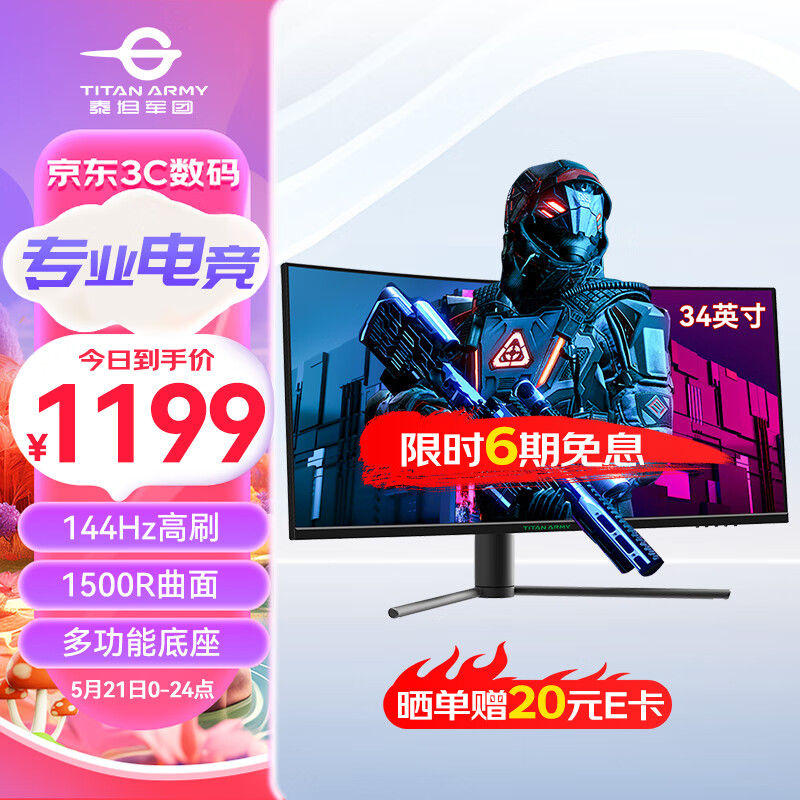 泰坦军团34英寸电竞带鱼屏 144Hz高刷WQHD广色域 1500R曲面屏 21:9 旋转升降 HDR技术电脑准4K显示器C34CHR价格:1399.00元!