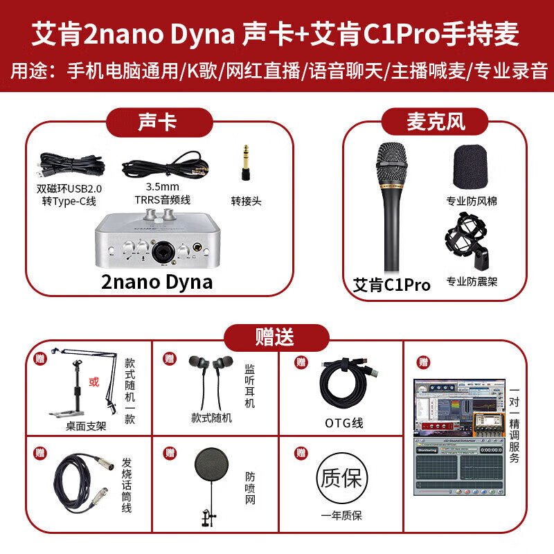 艾肯(iCON)2nano外置声卡+C1pro麦克风话筒套餐手机电脑喊麦唱歌录音主播直播设备 价格:2548.00元!