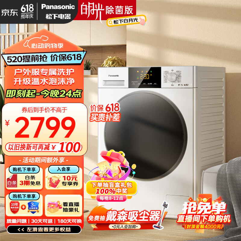 松下(Panasonic)滚筒洗衣机全自动 超薄全嵌【白月光除菌版】10公斤 温水泡沫净 户外服洗 525大筒径XQG100-3N18E价格:3099.00元!