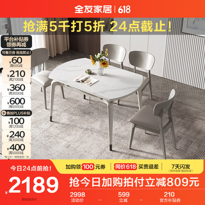 全友家居 餐桌现代简约岩板餐桌可圆可方伸缩功能吃饭桌子家具DW1121价格:2998.75元!