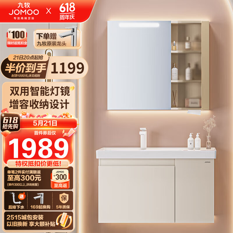 九牧(JOMOO)浴室柜陶瓷一体盆智能悬挂抗菌洗脸盆柜组合 80cm A2729-14BI-2价格:2599.00元!