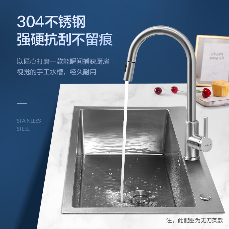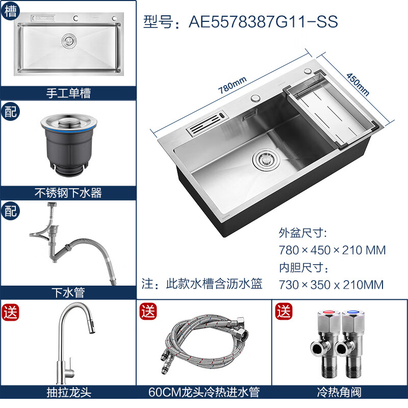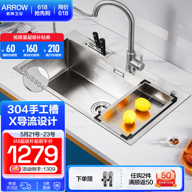 箭牌(ARROW) 304不锈钢加厚手工水槽大单槽厨房水槽洗菜盆一体盆大单槽 新78*45手工槽(含沥水篮+龙头)价格:1539.00元!