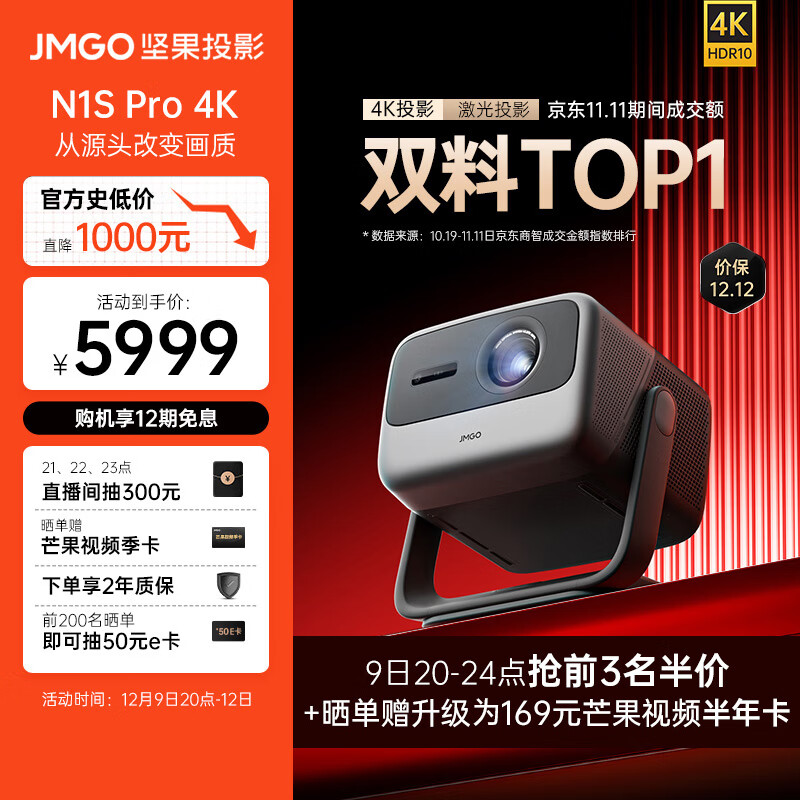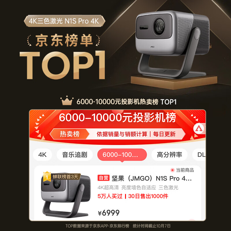 坚果(JMGO)N1S Pro 4K超高清三色激光 云台投影仪家用家庭影院白天投墙(2000CVIA 亮度自适应 墙色自适应价格:6599.00元!