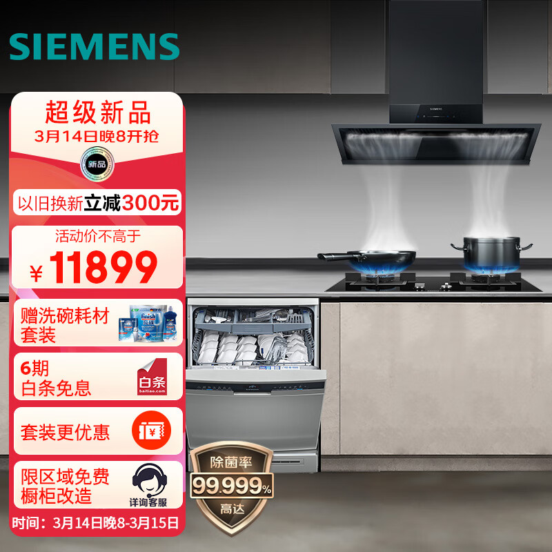 西门子16套大容量家用洗碗机精准涡流洗+吸油烟机灶具套装(天然气) SJ23HI88MC+LSVT1B3BNW+ER8KJF23MP价格:11899.00元!