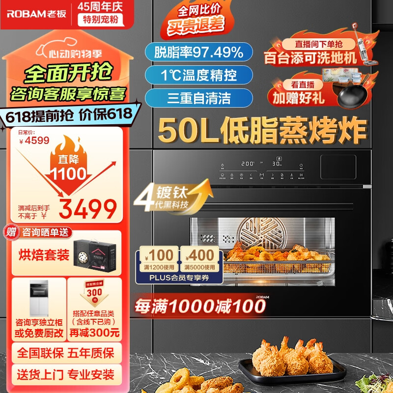 老板(Robam)CQ9161D蒸烤箱一体机嵌入式家用多功能50L专业蒸箱烤箱蒸烤炸3合1三重自清洁釉感自净价格:3799.00元!