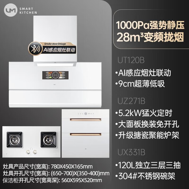 优盟(UM)油烟机家用大吸力七字型抽油烟机白色厨房侧吸式抽油烟机灶具保洁柜 烟灶保洁柜厨房三件套 天然气价格:3899.00元!