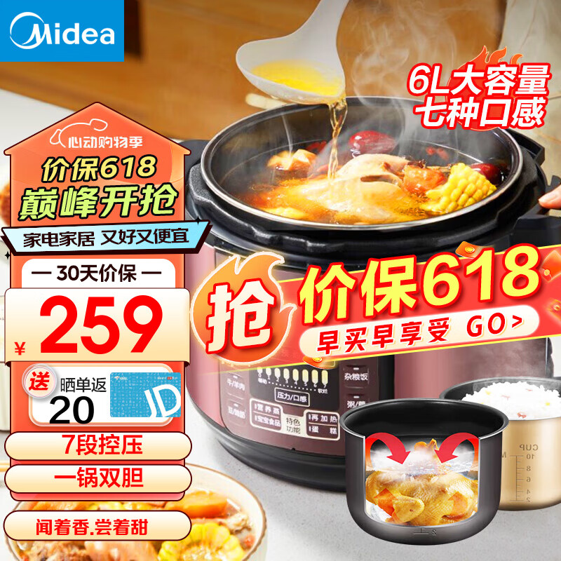 美的(Midea) 电锅 高压锅 电高压锅家用大容量多功能定时预约高压电饭煲电饭锅 推荐款【6L大容量 双胆】(5-12人) 6L价格:399.00元!