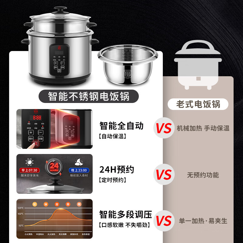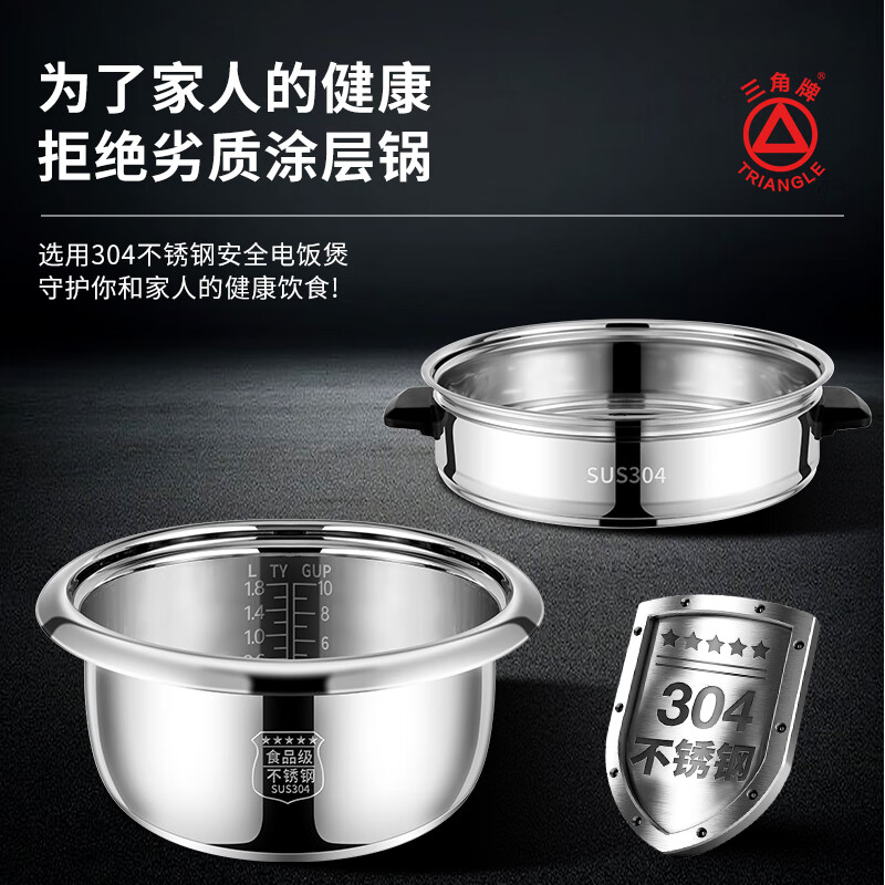 三角牌(Triangle) 电饭煲老式电饭锅不锈钢家用煮饭锅米饭锅带蒸笼家庭用 304不锈钢【智能款】 5L价格:259.00元!