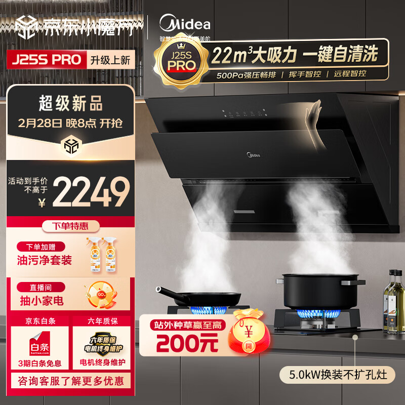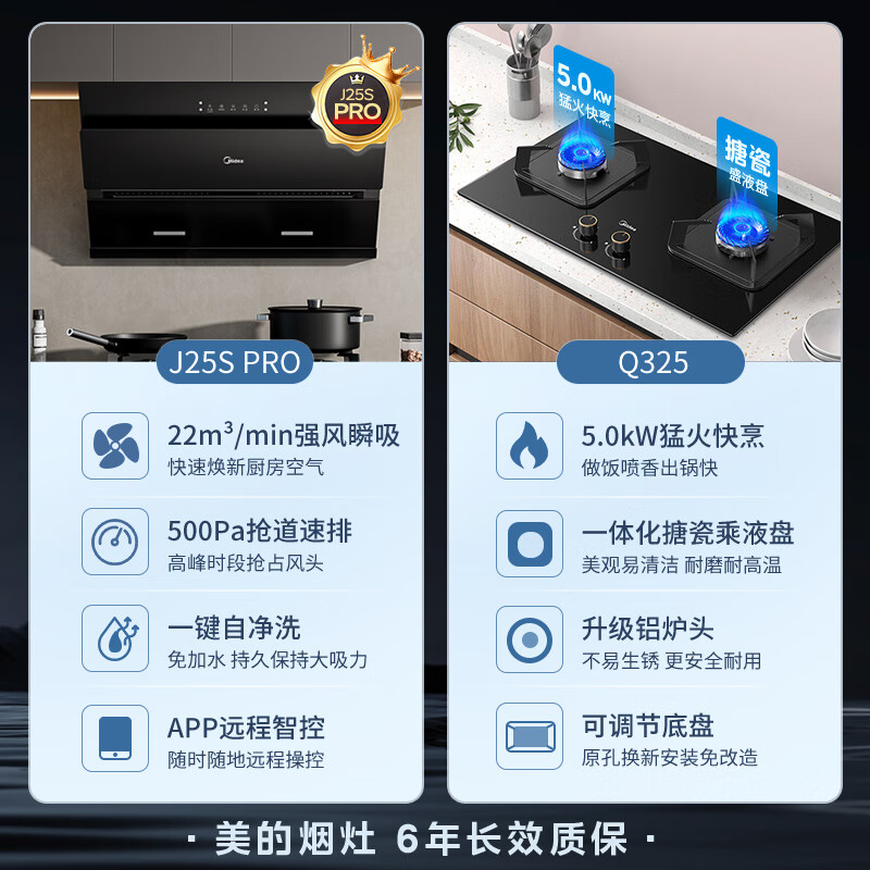 美的(Midea)抽油烟机燃气灶套装小户型厨房烟灶套装 22大吸力自动清洗油烟机灶具套装J25S PRO+Q325天然气价格:2249.00元!