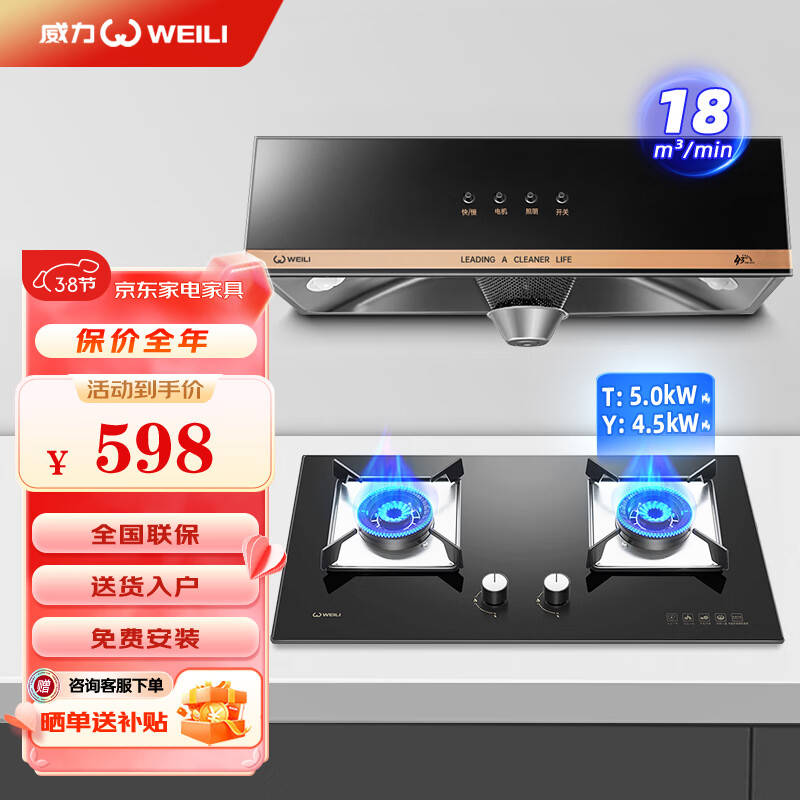 威力(WEILI)中式油烟机燃气灶套装大吸力厨房顶吸油烟机710mm家用老式吸油机灶具两件套WLT10+WL201(液化气)价格:598.00元!