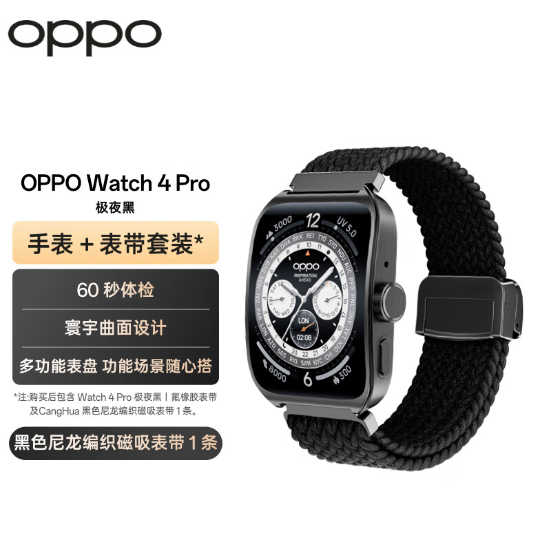 OPPO Watch 4 Pro 极夜黑 全智能手表 男女运动手表 智能健康eSIM电话手表+黑色尼龙编织表带套装价格:2342.00元!