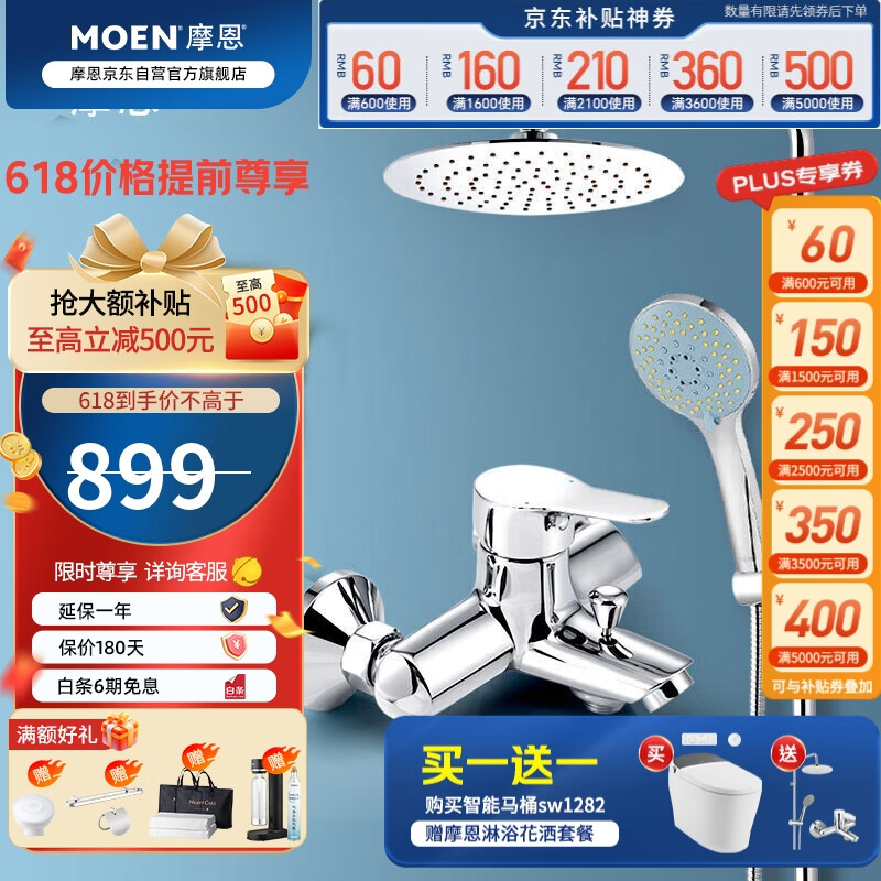 摩恩(MOEN)淋浴花洒套装 多功能增压手持喷头 8寸不锈钢圆形大顶喷龙头套装价格:1049.01元!