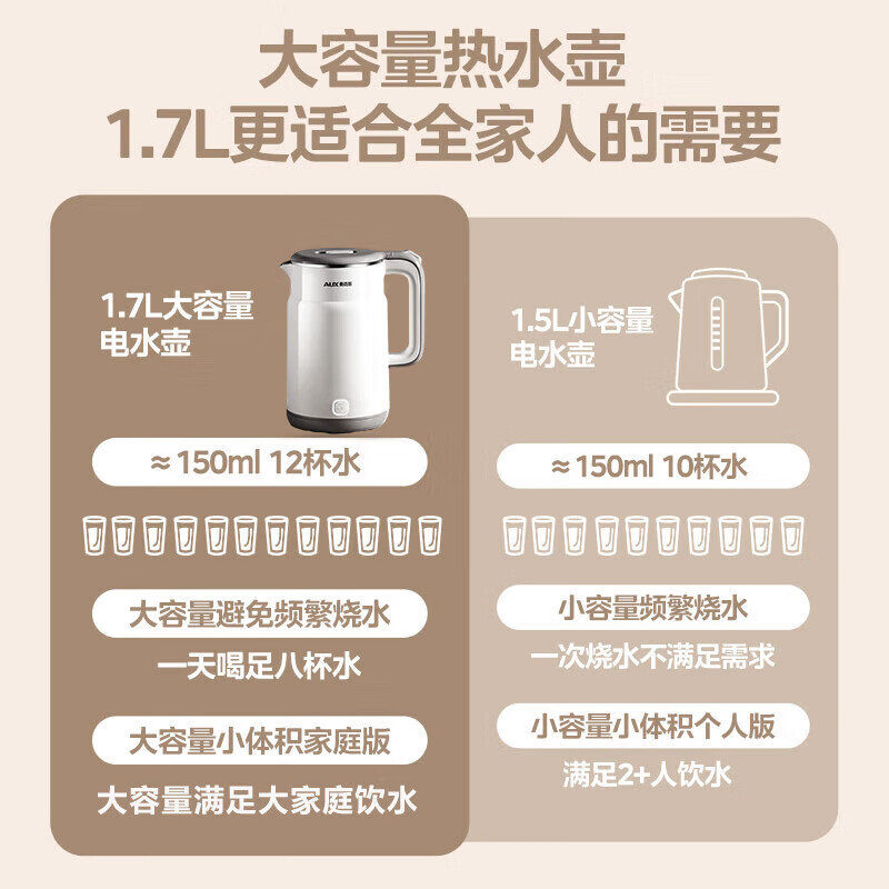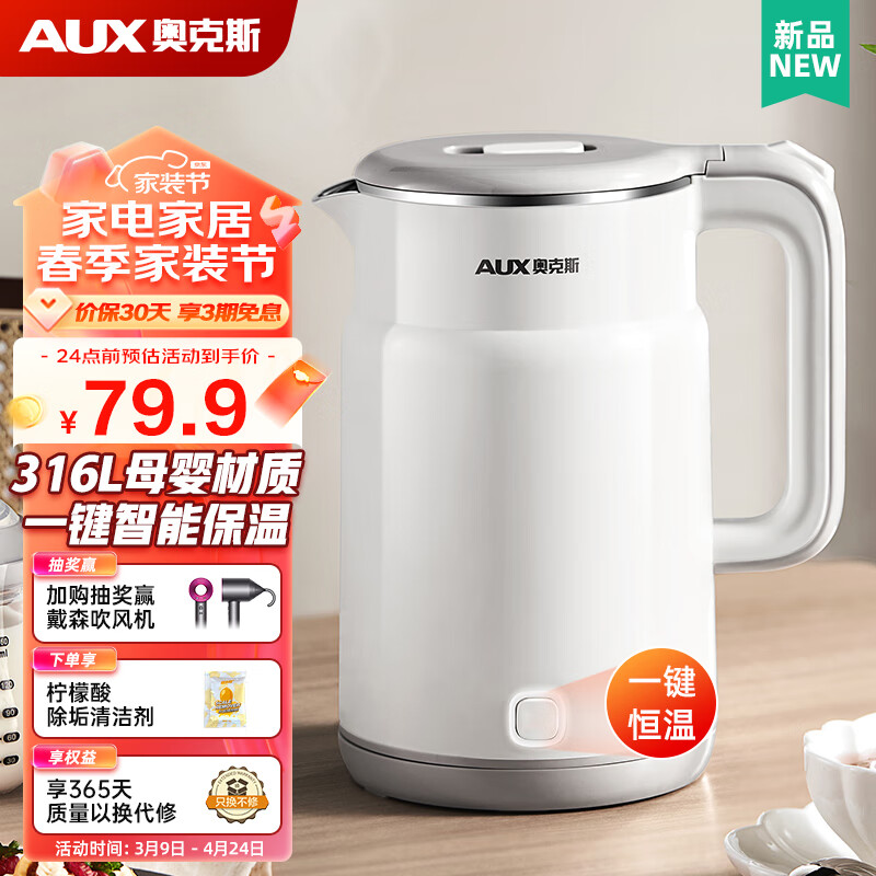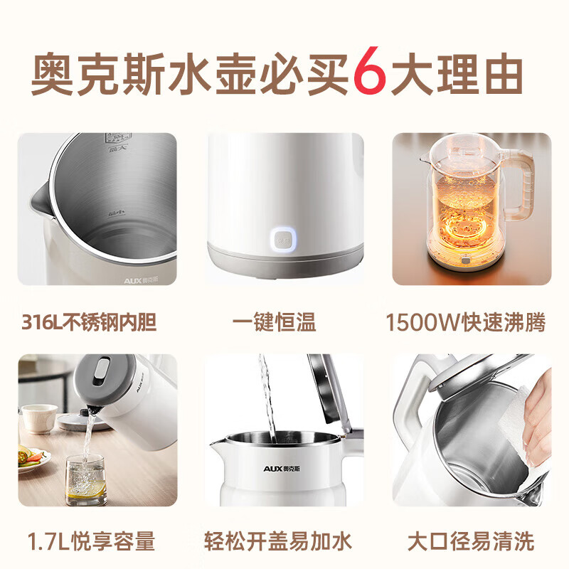 奥克斯(AUX)电水壶热水壶 1.7升大容量无缝保温 316L不锈钢防烫暖水壶家用开水壶烧水壶智能断电 ASS-15A2B02W 白色 1.7L价格:79.80元!