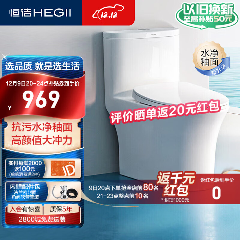 恒洁(HEGII)马桶506 水净釉面家用大冲力虹吸式坐便器HC0506PT-400价格:1169.00元!
