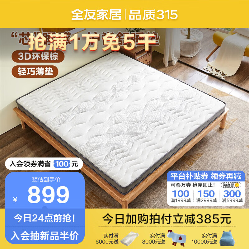 全友家居 床垫 3D透气多功能薄款棕垫200*150*10cm床垫 105189-2价格:1284.29元!