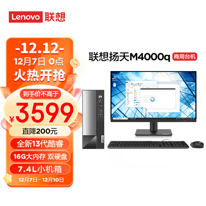 联想(Lenovo)扬天M4000q 英特尔酷睿i3 商用办公台式机电脑主机(13代i3-13100 16G 1T+512G Win11)21.45英寸价格:3599.00元!