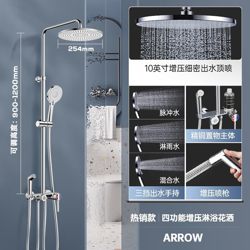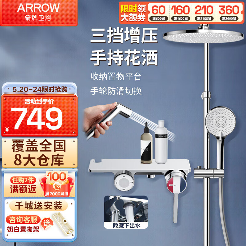 箭牌(ARROW) 淋浴花洒套装铜龙头沐浴家用浴室淋雨喷头顶喷花洒冷热淋浴喷头 【D款】增压置物四功能花洒3492C价格:849.00元!