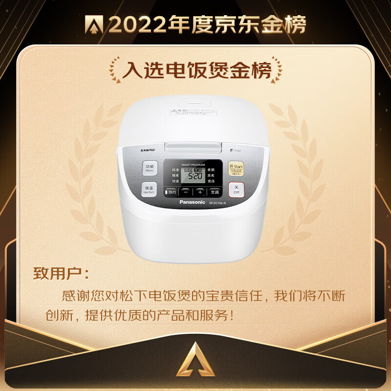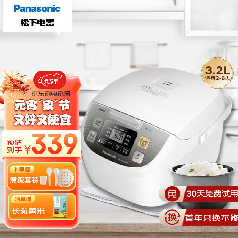 松下(Panasonic)家用智能电饭煲3.2L 多功能菜单 备长炭内胆 预约智能烹饪米饭不粘锅电饭锅适合2-6人SR-DC106轻奢价格:339.00元!