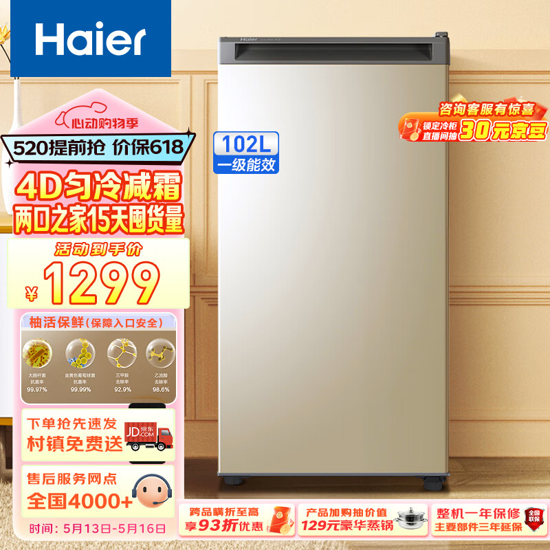 海尔(Haier)102升匀冷家用立式冰柜 母乳冷冻柜抽屉式冷柜囤货小冰柜家用小型冰箱BD-102MDT 以旧换新价格:1179.00元!