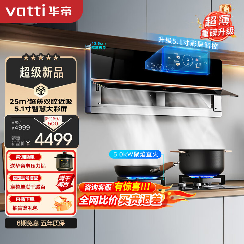 华帝(VATTI)抽油烟机 i111X6S超薄侧近吸家用变频大吸力25风量自动清洗彩屏5.0KW燃气灶具套装X6pro天然气价格:4299.00元!