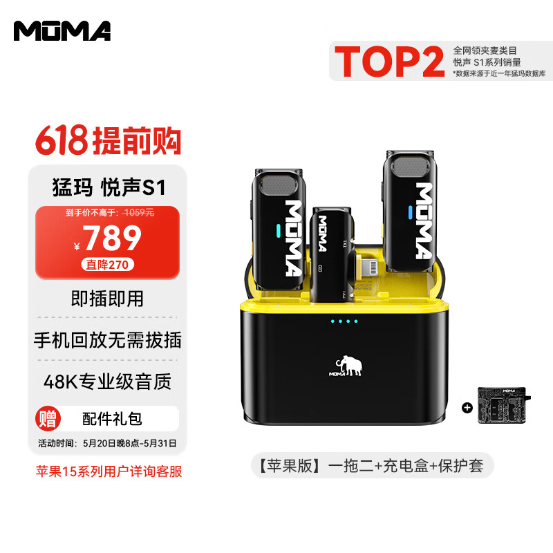 猛玛(MOMA)无线领夹麦克风猛犸悦声S1苹果版一拖二vlog采访户外降噪直播手机收音麦价格:789.00元!