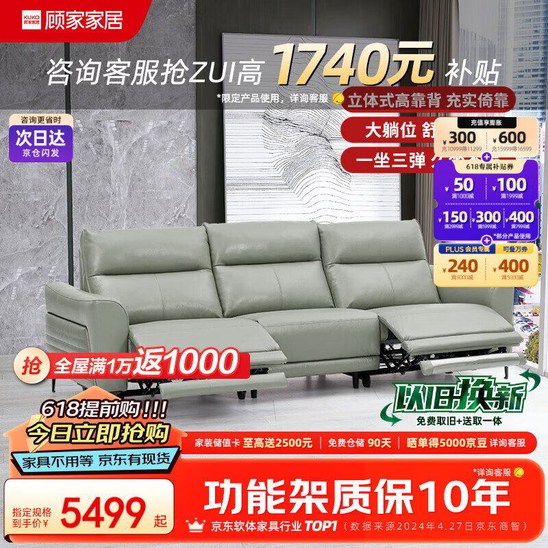 顾家家居(KUKA)头层牛皮沙发客厅高脚功能沙发小户型6055绿3双2电动【京仓闪发】价格:5299.00元!