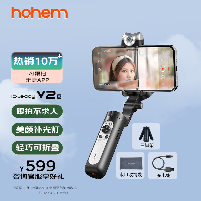 浩瀚(hohem)V2S 手机稳定器 手持云台稳定器 三轴防抖跟拍云台 自带AI视觉传感器 折叠收纳带三脚架价格:679.00元!
