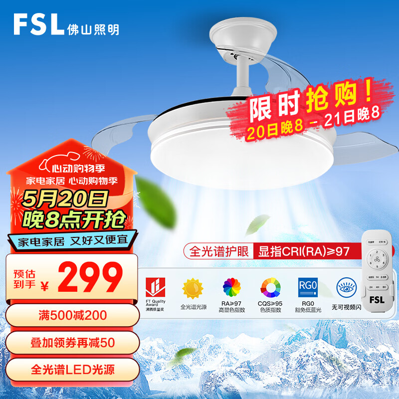 FSL佛山照明吊扇灯风扇灯餐厅客厅卧室led灯遥控调色灯饰灯具清夏白价格:549.00元!