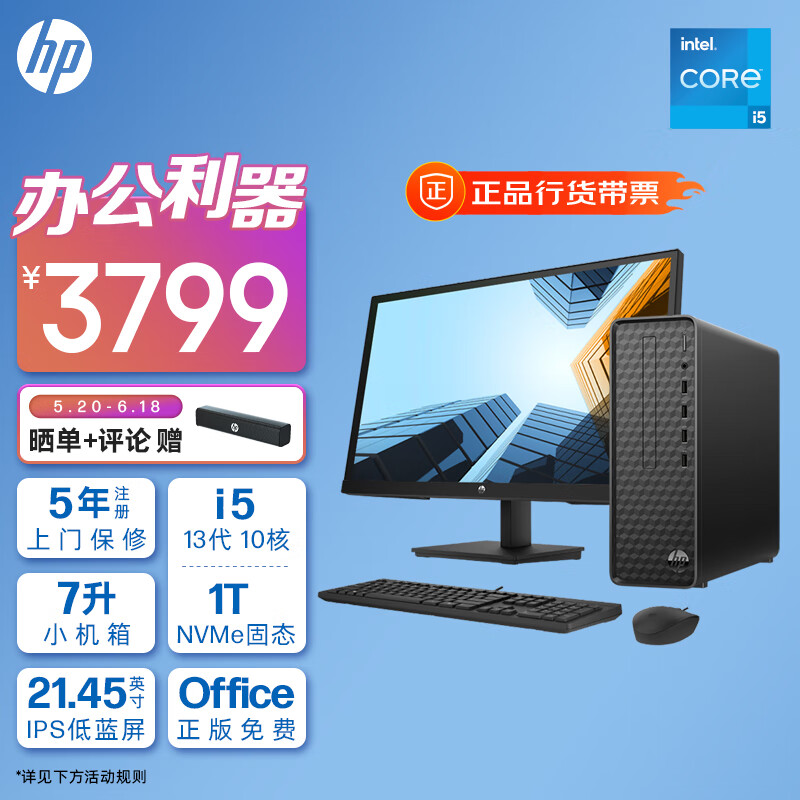 惠普HP 星Box商务办公台式电脑主机(13代酷睿i5-13400 16G 1TB固态硬盘 WiFi 注册五年上门)+21.45英寸价格:3799.00元!