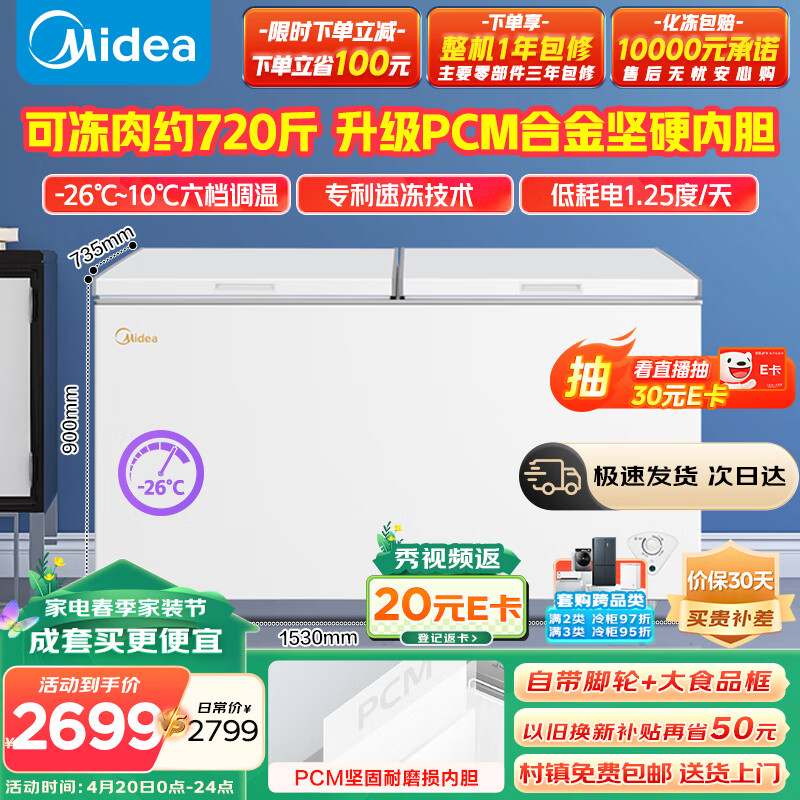 美的(Midea)521升卧式商用家用冰柜 商用大容量 冷藏柜冷冻柜冰柜家用冰箱大冷柜BD/BC-521DKM(E) 以旧换新价格:2799.00元!