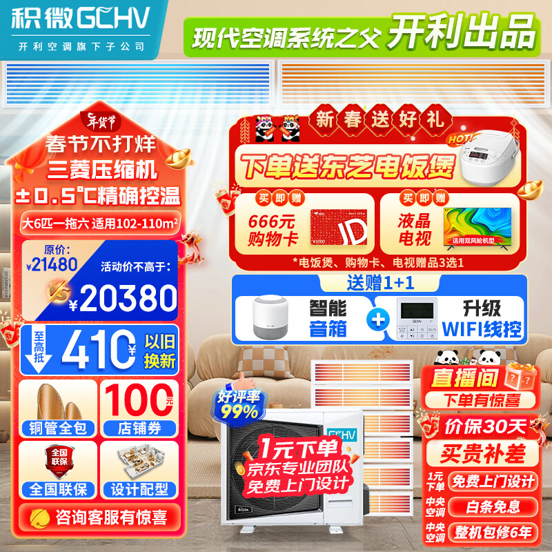 GCHV中央空调多联机 大6匹一拖六 一级能效直流变频冷暖嵌入式风管机空调 适用超大户型 EC系列价格:20480.00元!