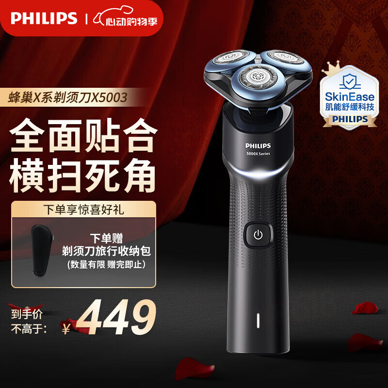飞利浦(PHILIPS)电动剃须刀全新蜂巢X刮胡刀 SkinEase肌能舒缓科技 男士生日520情人节礼物送男朋友送老公送父亲 【蜂巢X炫光黑】X5003 普通装价格:499.00元!