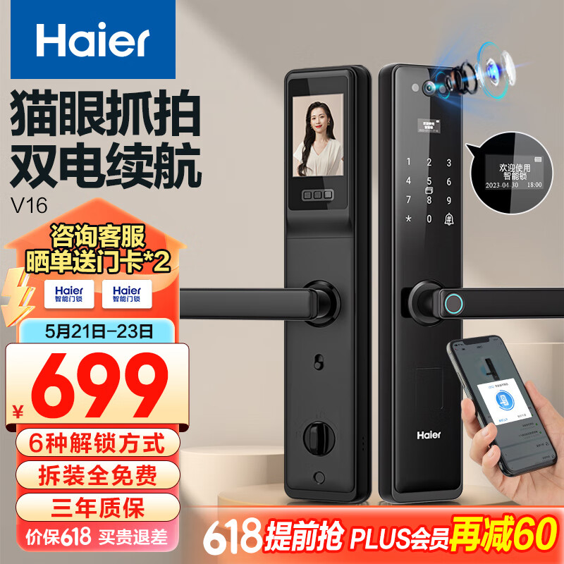 海尔(Haier)指纹锁智能门锁密码锁可视猫眼智能锁带监控摄像头HFH-16V-U1价格:1299.00元!