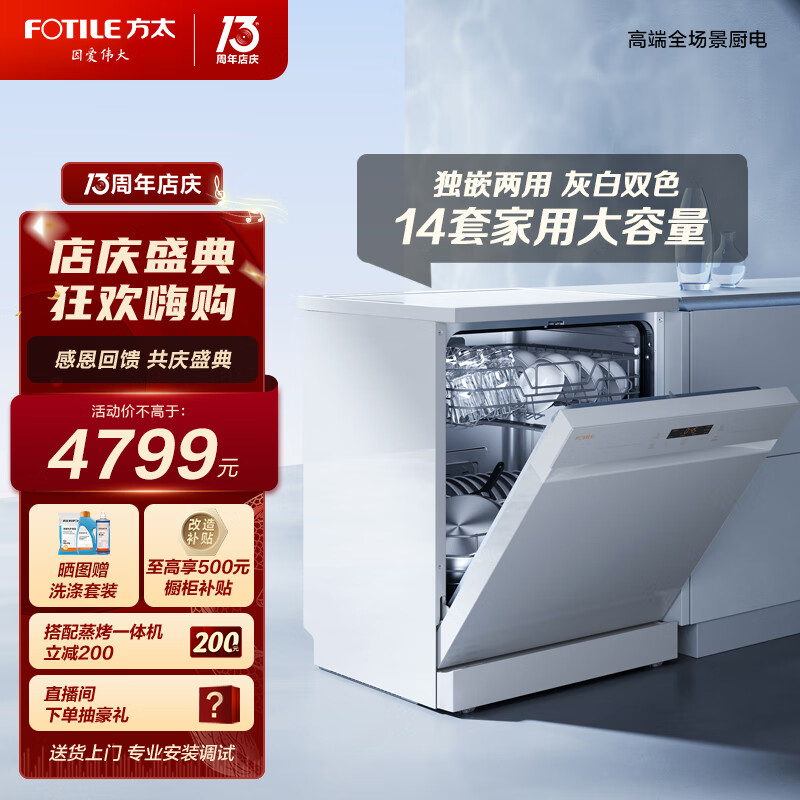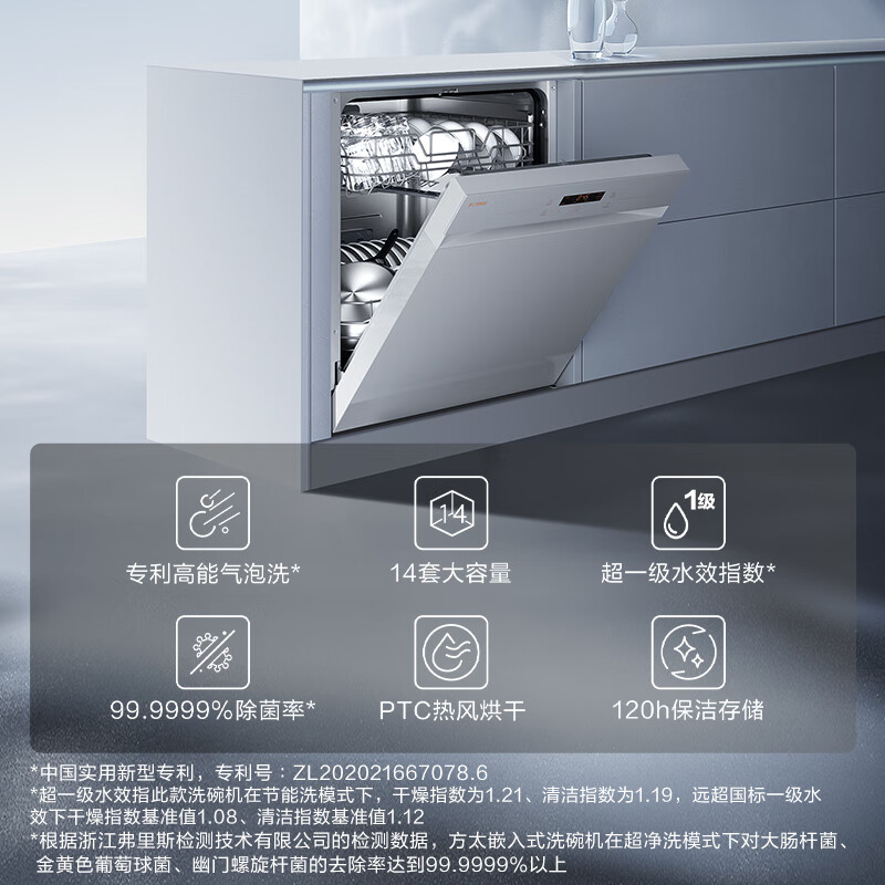 方太(FOTILE)嵌入式洗碗机家用 高能气泡洗 14套大容量 独嵌两用 双色可选 下层速洗 120H长效保洁存储 V5M价格:4799.00元!