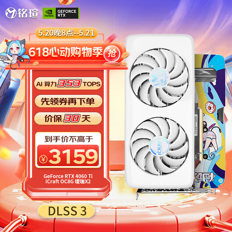 铭瑄(MAXSUN)GeForce RTX 4060 Ti iCraft OC 8G 瑷珈X2 DLSS 3 电竞游戏设计渲染智能学习直播电脑独立显卡价格:3319.00元!