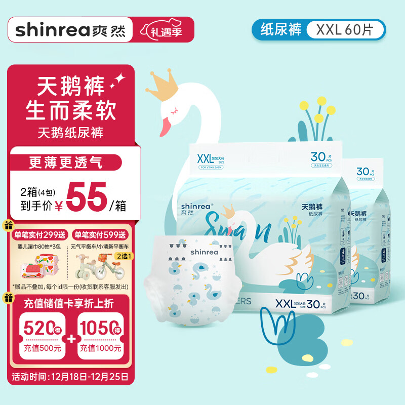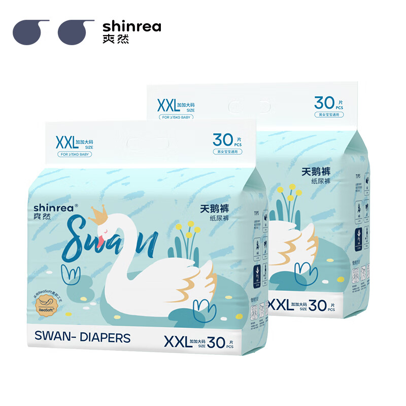 爽然(shinrea)天鹅系列纸尿裤XXL60片超薄男女通用婴儿尿不湿价格:100.00元!