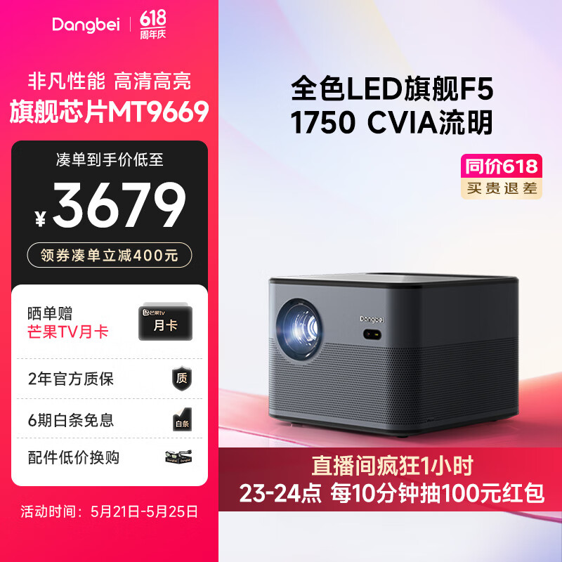 当贝 F5 投影仪 家用卧室投影机 家庭影院(全色LED旗舰 MT9669 1750 CVIA流明 双自动对焦 )价格:3999.00元!