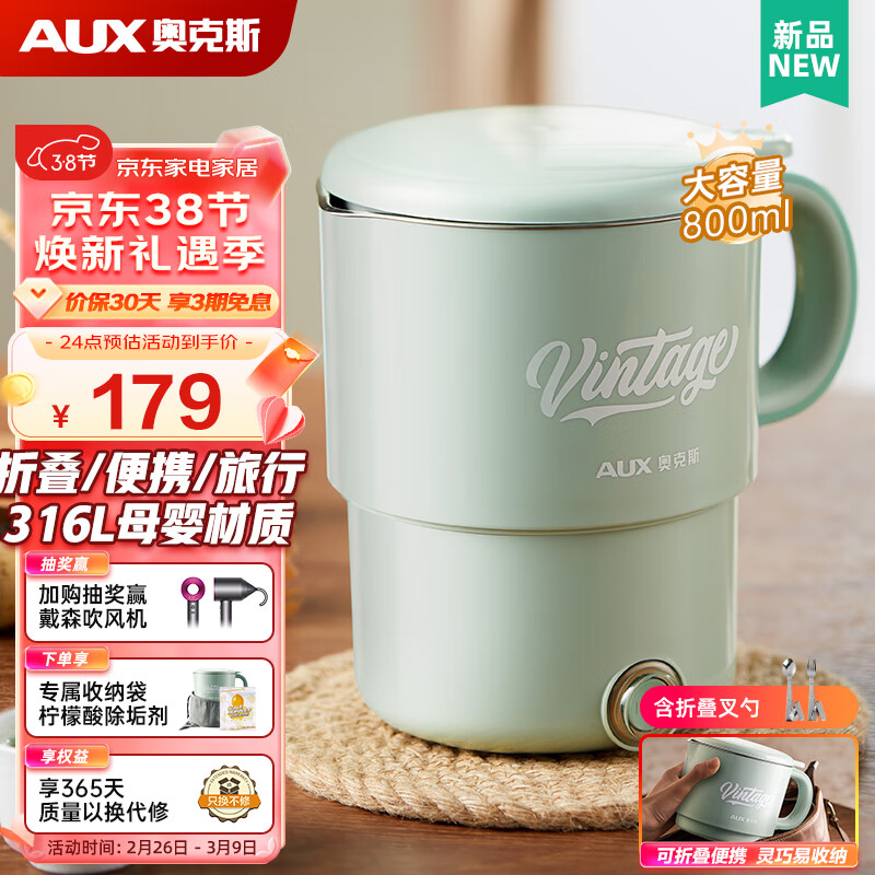 奥克斯(AUX)便携式烧水壶 316L不锈钢折叠水壶烧水旅行电水壶 家用烧水杯养生冲奶保温 HX-A0803E 迷雾绿(含折叠叉勺) 0.8L价格:219.00元!
