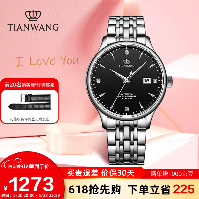 天王(TIAN WANG)手表男 520情人节礼物昆仑系列钢带机械男表黑色GS5876S.D.S.B价格:1273.00元!
