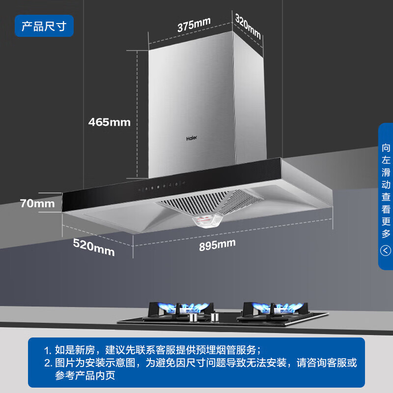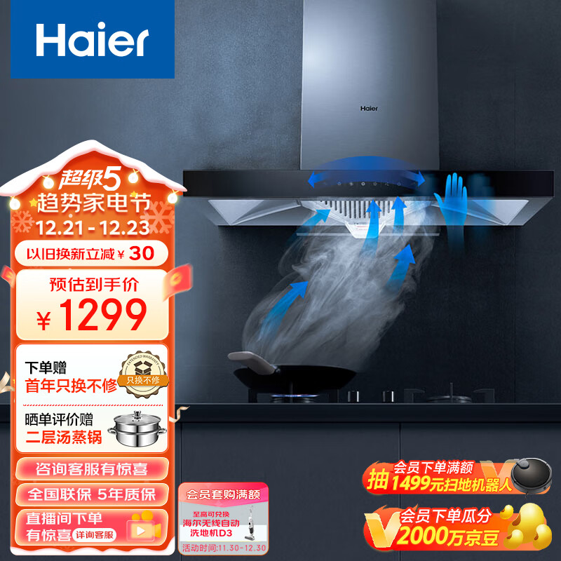 海尔(Haier)抽油烟机 欧式吸油烟机 21m3/min大吸力 自动清洗 挥手智控 家用顶吸排烟机以旧换新T11价格:1843.00元!