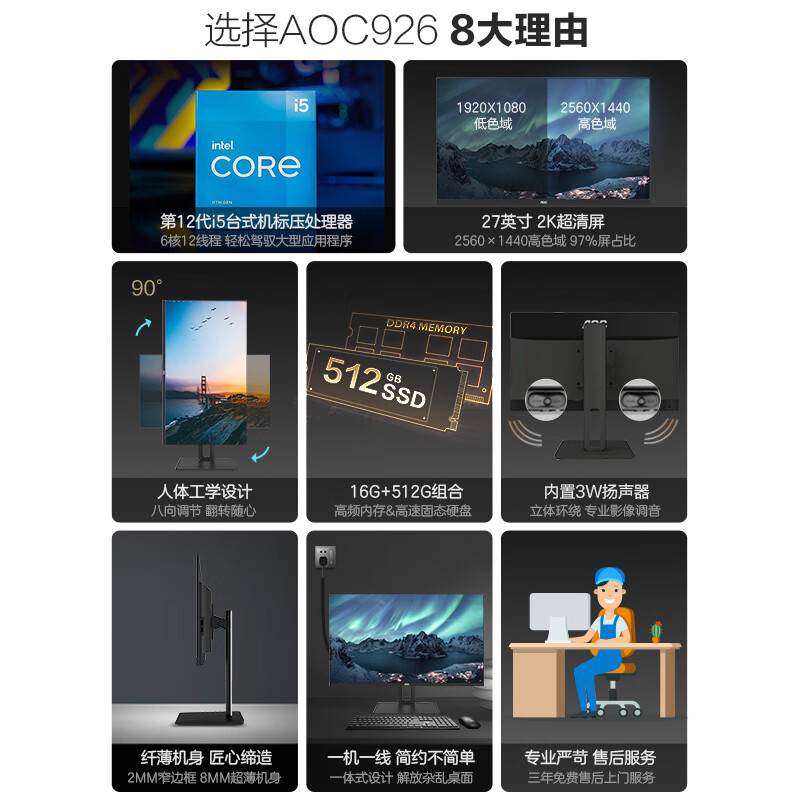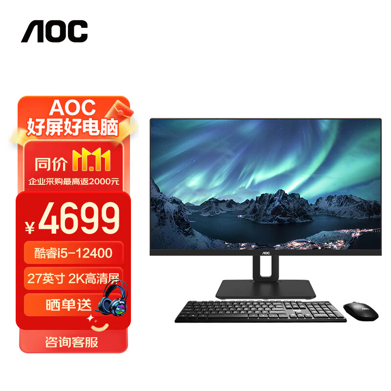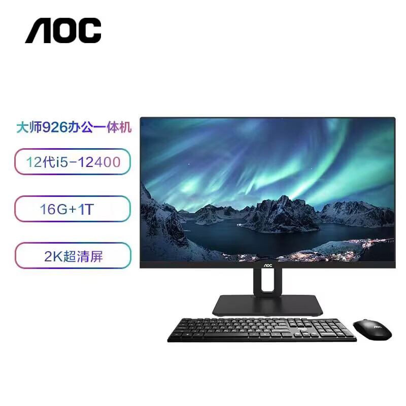 AOC AIO大师926Plus 27英寸 2K 高清办公一体机台式电脑(12代i5-12400 16G 1TSSD 无线WiFi6 旋转升降 )灰价格:4698.00元!