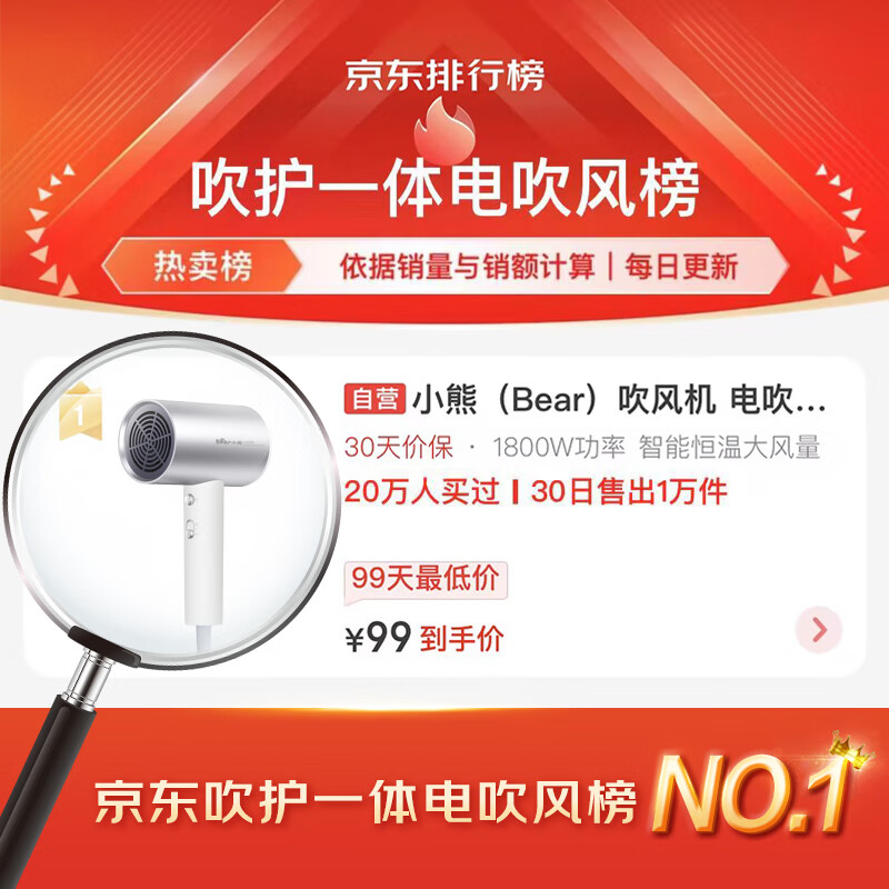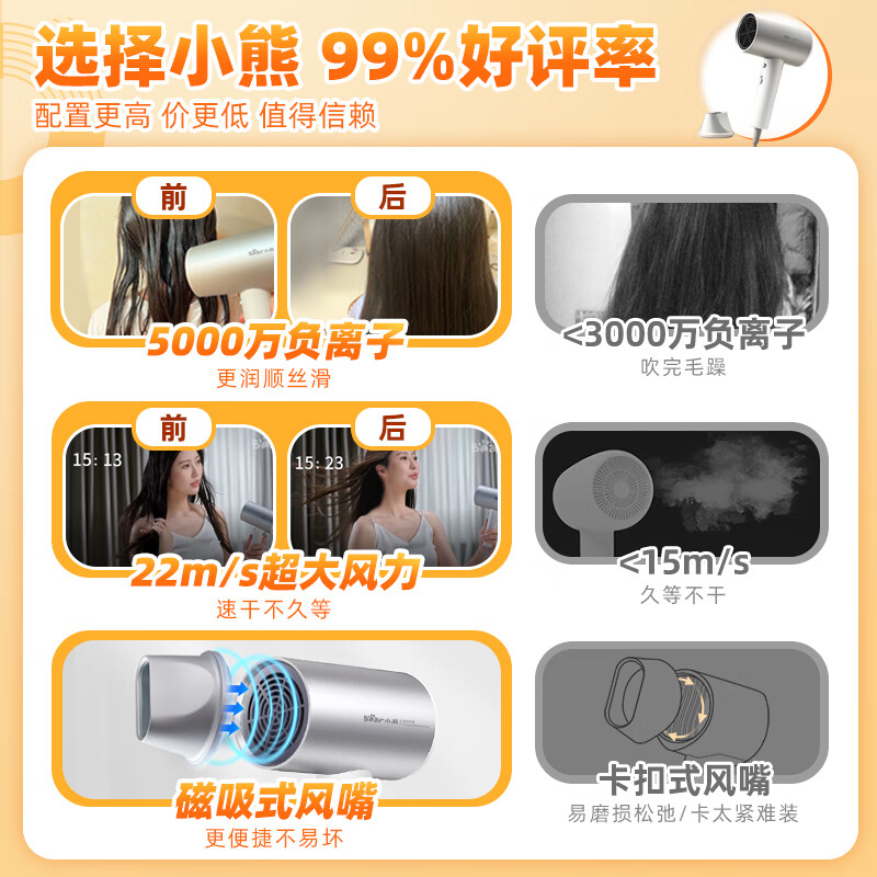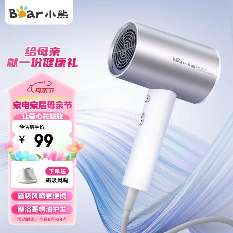 小熊(Bear)吹风机 电吹风家用 吹风筒大功率高速风力速干 宿舍便携低噪负离子不伤发专用磁吸风嘴DCF-C18E5价格:99.00元!