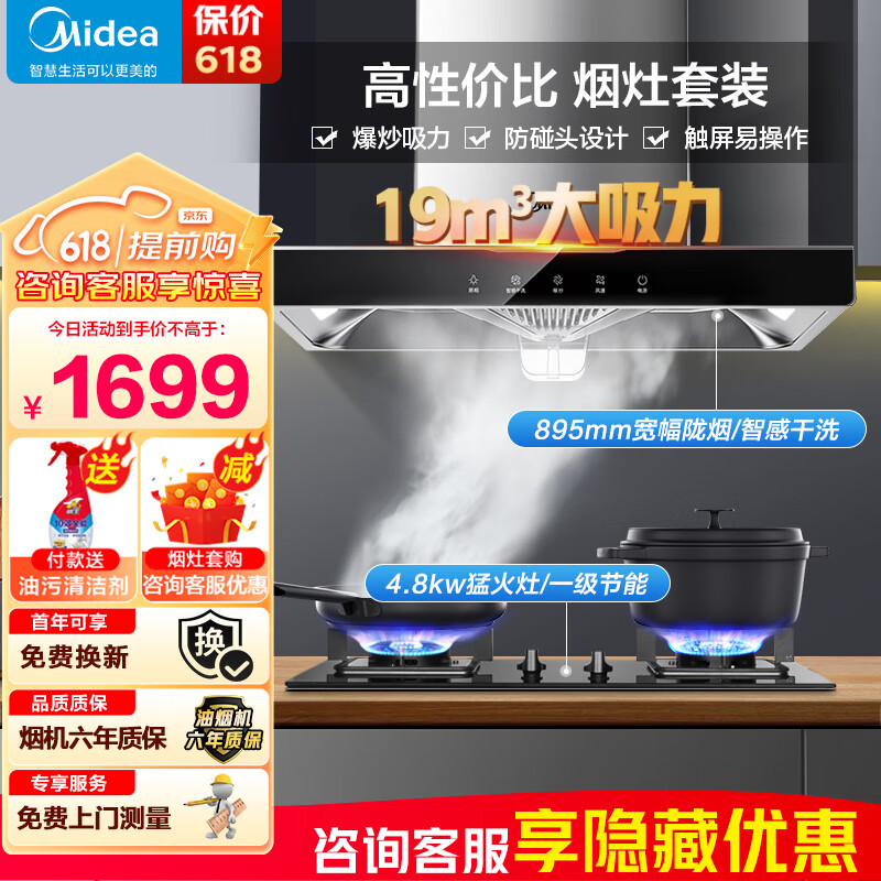 美的(Midea)家用抽油烟机19立方大吸力欧式顶吸油烟机燃气灶具烟灶套装 自清洁 天然气 厨房电器T33A+Q217价格:1699.00元!