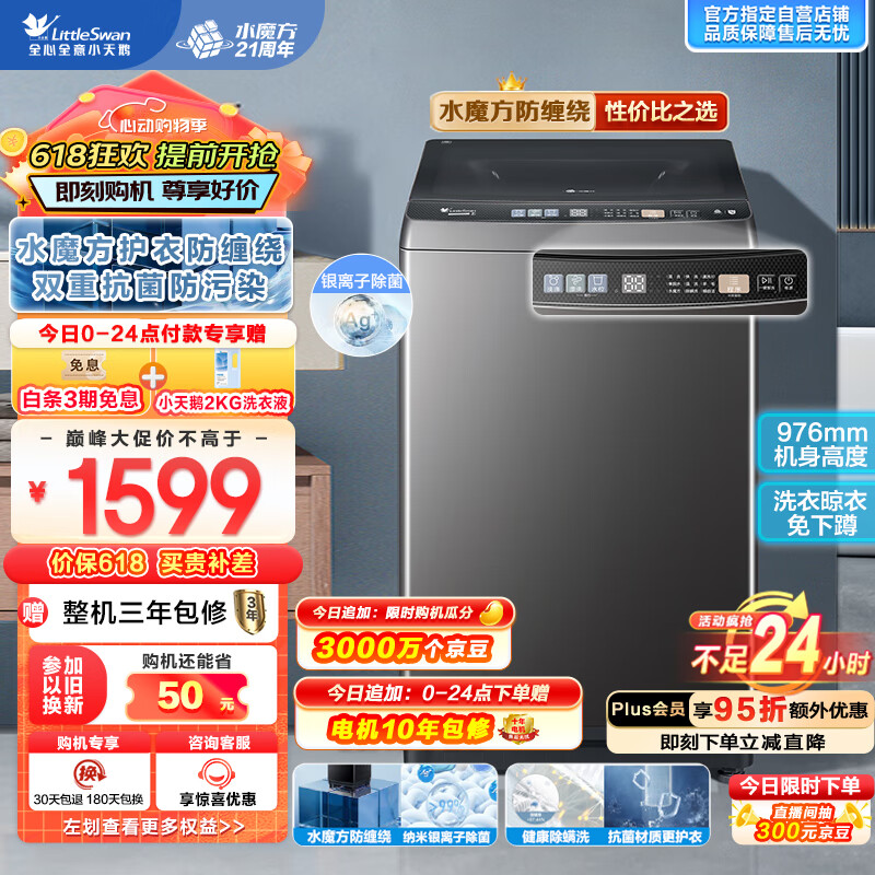 小天鹅(LittleSwan)波轮洗衣机全自动 水魔方系列 【TB100V81T】 防缠绕 纳米银离子除菌 深层除螨 无孔内桶 10公斤价格:1599.00元!