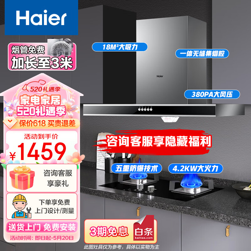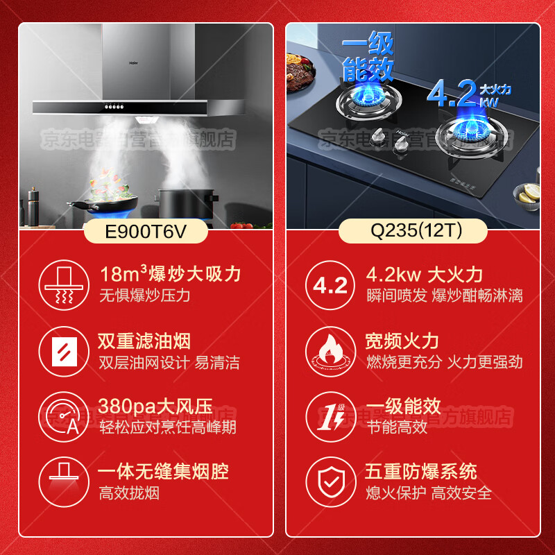 海尔(Haier)抽油烟机燃气灶套装 欧式顶吸一级能效 18m3大吸力吸油烟机家用 E900T6V烟灶套装4.2KW灶[家电]价格:1459.00元!