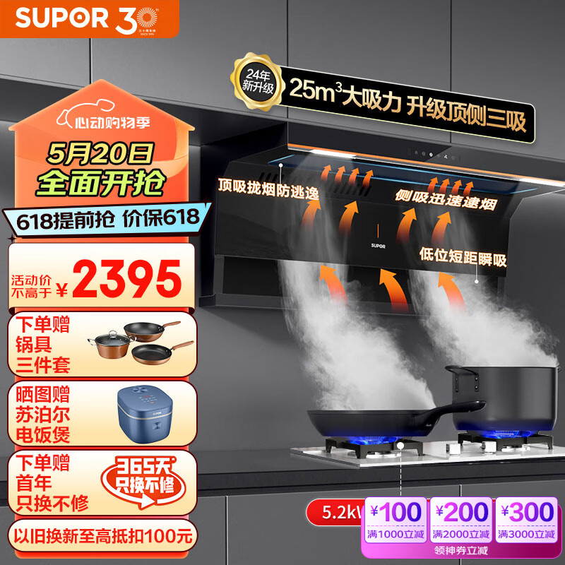 苏泊尔(SUPOR)抽油烟机 双腔拢烟顶侧双吸油烟机灶具套装 25立方大吸力变频烟灶 家用油烟机燃气灶 DL35+DS35天价格:2395.00元!