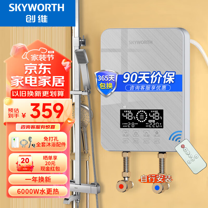 创维(Skyworth)即热式电热水器速热式小型恒温家用节能变频恒温洗澡机多功率可调D875拉丝银6000W价格:409.00元!